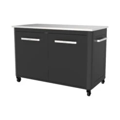 Die Tischplatte besteht aus rostfreiem Stahl und ist dadurch robust und langlebig, zudem lässt sich Arbeitsfläche anschließen leicht reinigen. Der Tisch ist aus verzinktem und schwarz lackiertem Stahl gefertigt und hat zwei Türen. Er verfügt zudem über 4 starke Ø75mm Räder, die galvanisch verzinkt und schwarz pulverbeschichtet sind.