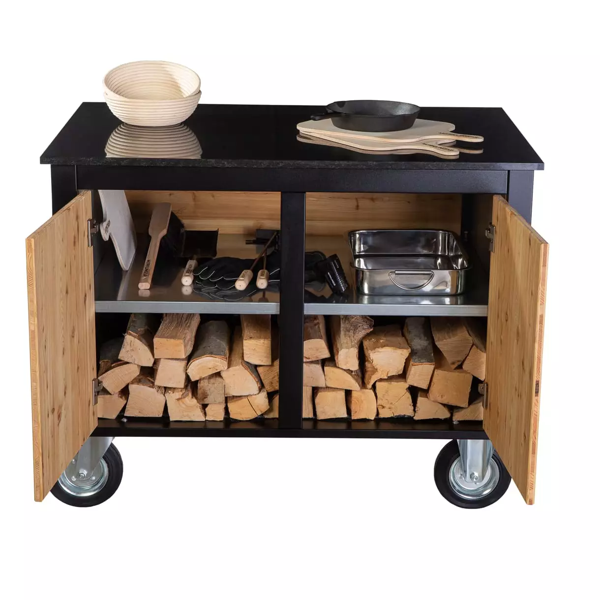 Der Rahmen des Moduls besteht aus pulverbeschichtetem Stahl und verfügt über Vollgummiräder mit Feststellbremse, was eine leichte Beweglichkeit des Moduls ermöglicht und gleichzeitig ein sicheres Stehen gewährleistet. Der Innenraum des Moduls bietet viel Stauraum für Zubehör, Holz und andere Utensilien.