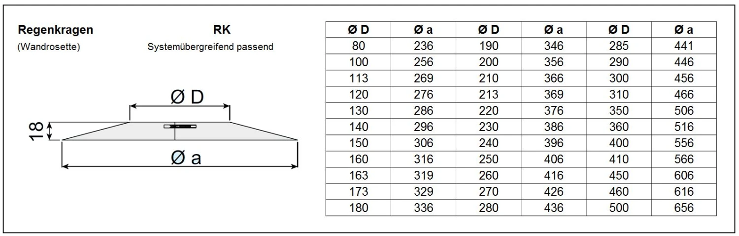Aus hochwertigen V2A Edelstahl in wählbaren AuĂźendurchmessern 80 – 500 mm in der Materialstärke: 0,6 mm (1,0 mm auf Anfrage) zum Abdecken von und Wand- und DeckendurchfĂĽhrungen.