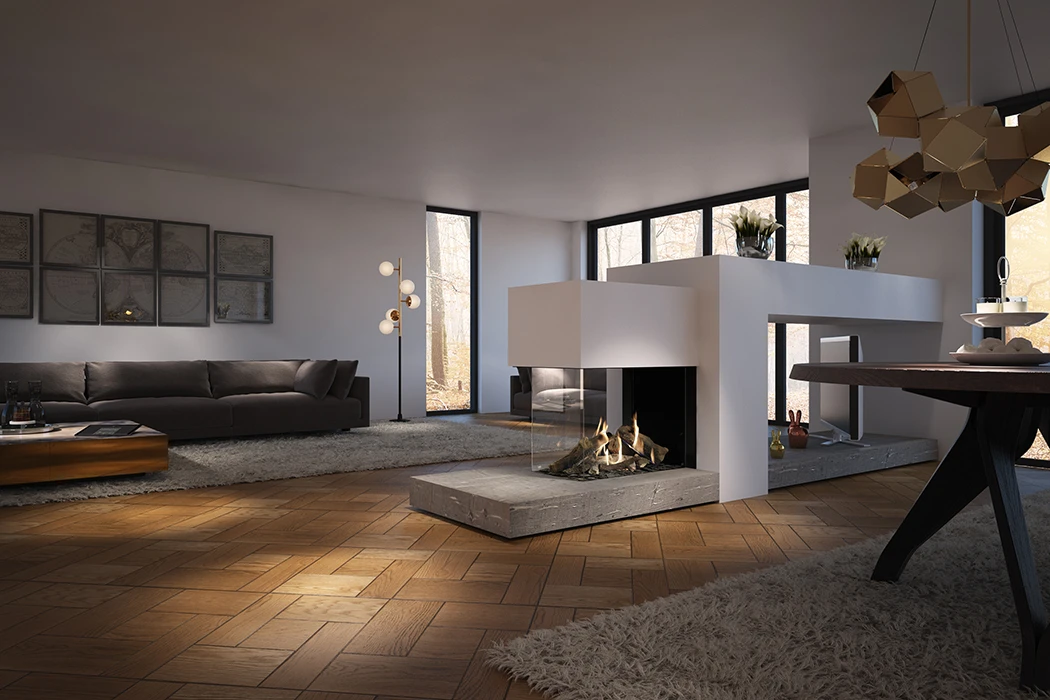 Ob Sie einen Raumteiler suchen, um zwei Räume stilvoll voneinander zu trennen, oder einfach die romantische Atmosphäre eines Kamins aus verschiedenen Winkeln Ihrer Wohnung erleben möchten – dieser Kamin ist die perfekte Lösung. Mit seiner Feuerraum Einsicht über drei Seiten können Sie die Faszination des flackernden Feuers aus verschiedenen Blickwinkeln genießen und die Wärme in Ihrem Zuhause optimal verteilen. Besonders in L-förmigen Wohnzimmern oder in Ecken entfaltet dieser Kamin seine volle Pracht.