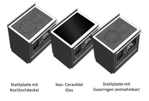 - Herdplatte aus 8 mm Stahl oder Ceranglas sowie wahlweise mit Kochlochdeckel oder Ringen in Gusseisen
