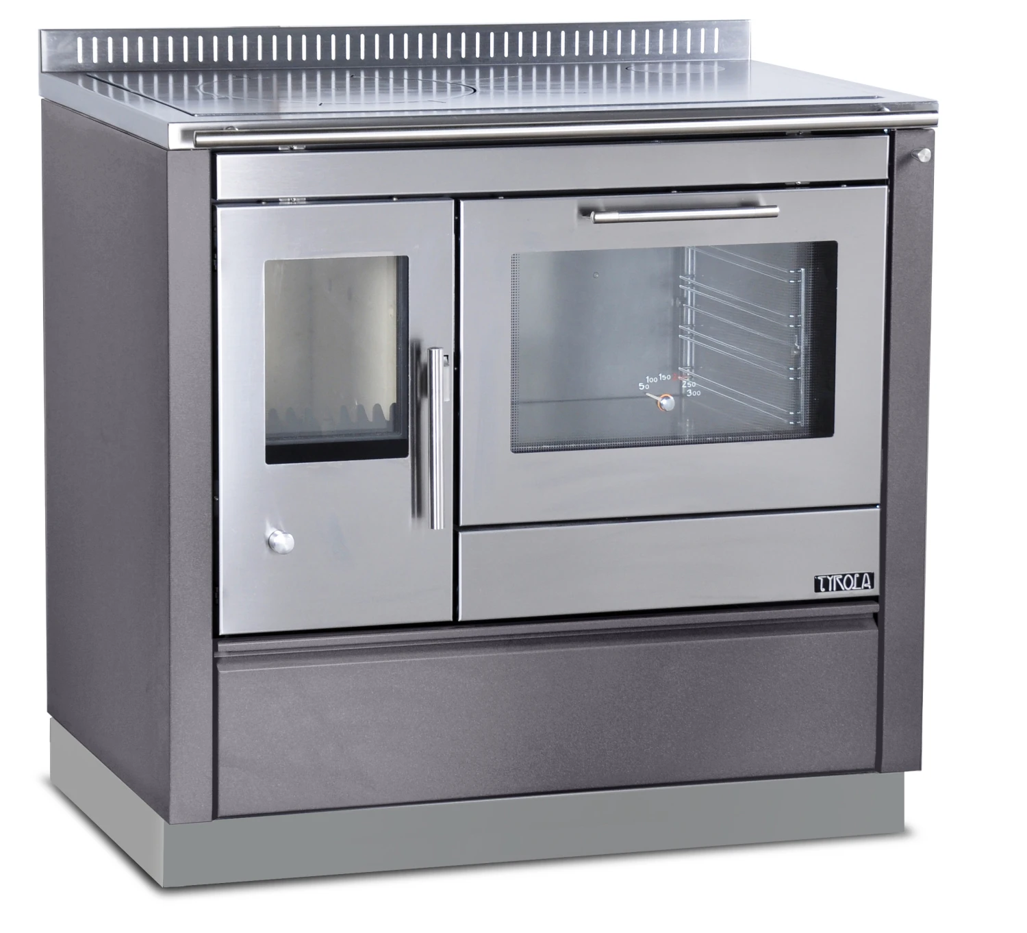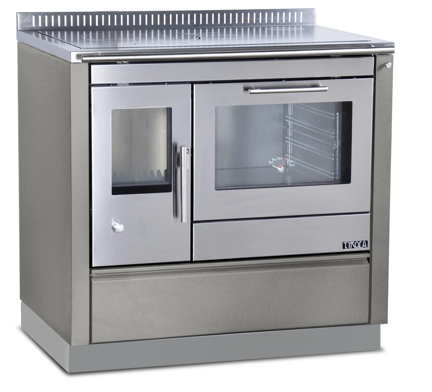 - Edelstahlbackraum mit Beleuchtung und Thermometer, zweifach verglaster TĂŒr (wahlweise FlĂŒgel- oder KlapptĂŒr, rechts oder links)