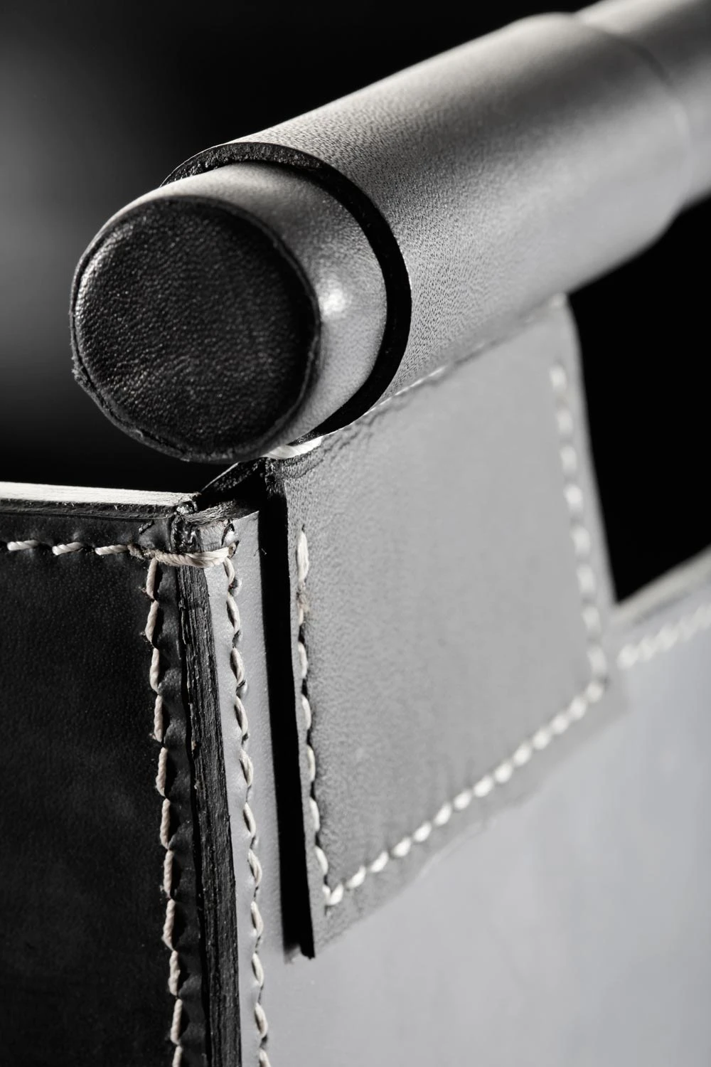 Der Lederkorb zeichnet sich durch eine schlichte und zugleich elegante Optik aus. Die schwarze Oberfläche des Korbs ist mit weißen Nähten dekorativ verziert, was dem Gesamtbild eine ansprechende Note verleiht. Um den Transport zu erleichtern, sind an den Seiten des Korbs zwei robuste Holzgriffe angebracht, die mit Leder umfasst sind. Diese sorgen nicht nur für einen angenehmen Griff, sondern fügen sich auch harmonisch in das Gesamtdesign des Korbs ein.