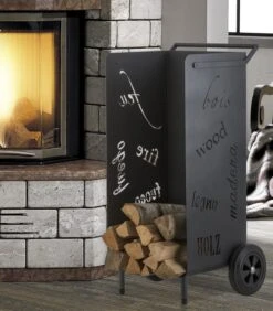 Kaminholzregal aus Stahl in graphitgrau â SchriftzĂŒge „Holz“ und „Feuer“