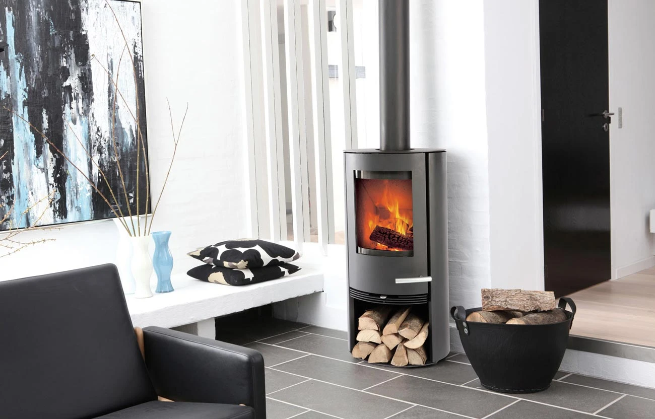 Der schwarze Korpus ist aus Stahl. Die Innenwände der Brennkammer bestehen aus Vermiculite und Gusseisen. Ebenfalls aus extrem hitzebeständigem Gusseisen wurde die Holzablage im Inneren des Ofens gegossen. Alle Materialien werden vom dänischen Markenhersteller sorgfältig verarbeitet und gelten als besonders langlebig. Unterhalb der Brennkammer befindet sich ein offenes Holzlagerfach.