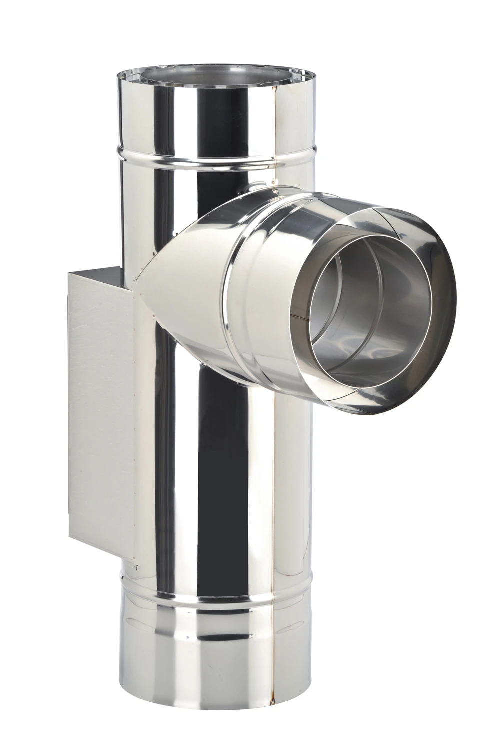 Doppelwandige Prüföffnung und 90° Feuerungsanschluss in einem Bauteil aus hochwertigen V4A Edelstahl in wählbaren Querschnitten 113- 00 mm in der Materialstärke 0,6 mm (1,0 mm auf Anfrage) mit 25 mm Wärmedämmung (siehe oben).