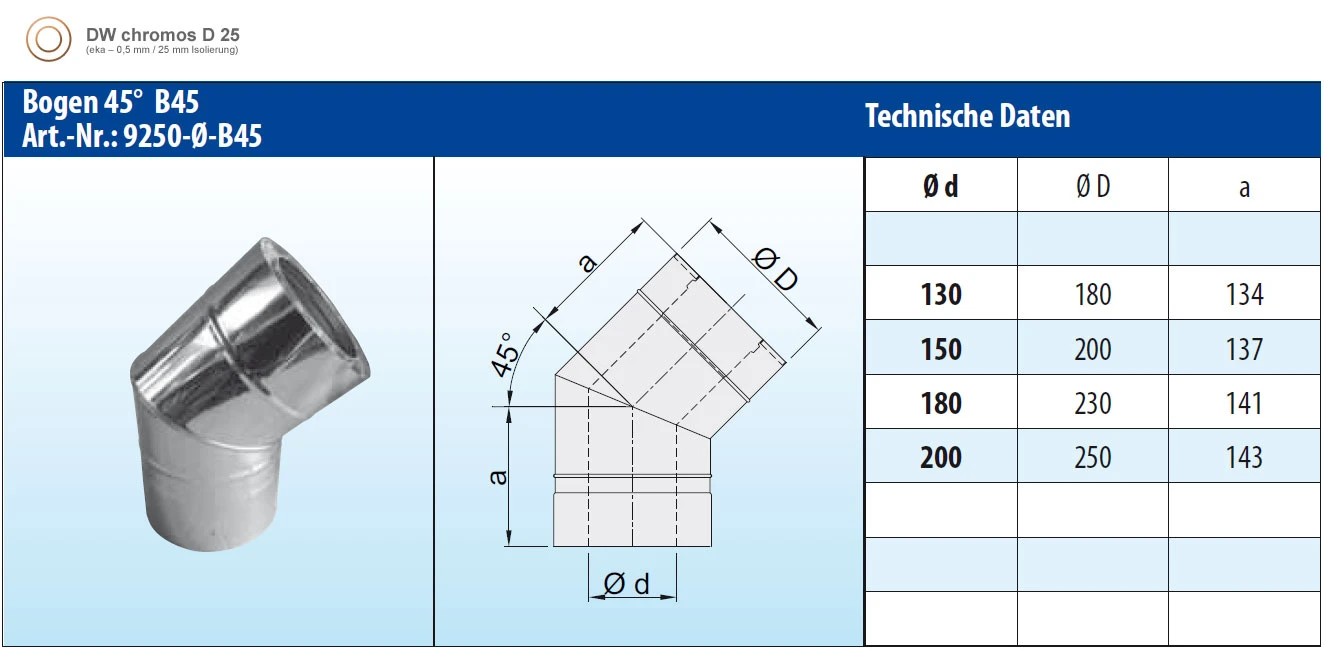Schornstein Winkel 45 Grad / doppelwandig / eka chromos D 25